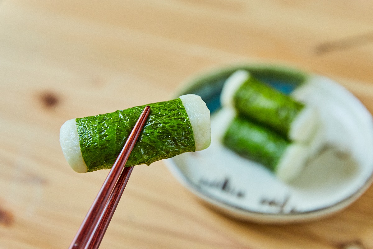 「しそかをり巻」は白身魚のすり身を紫蘇で包んで揚げました。鈴廣特製の肥料を使って香りよい青じそを農家さんに栽培していただいています。