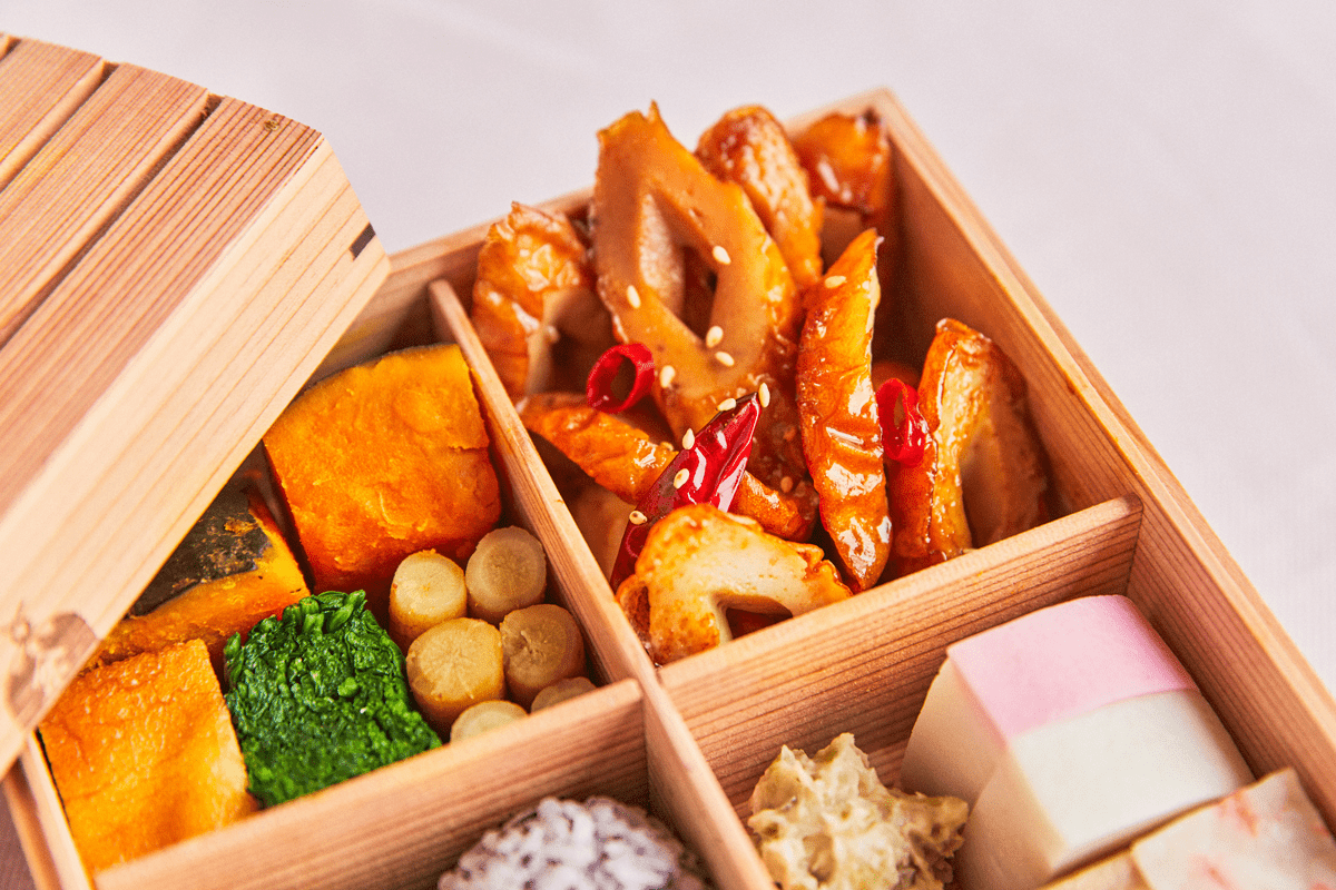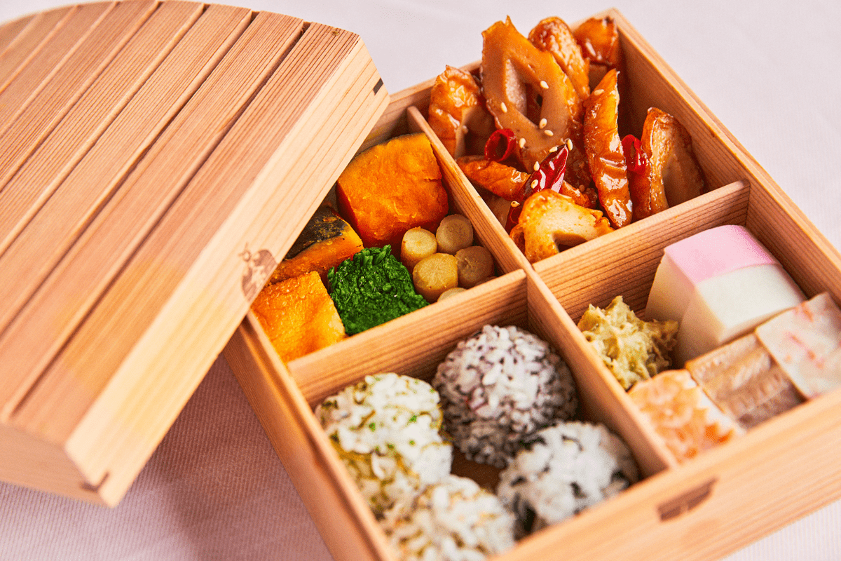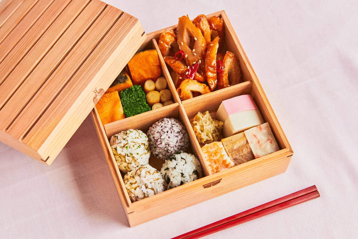 今回のお花見弁当には、鈴廣の「謹上蒲鉾」「わさび漬」を詰めました。おにぎりには鈴廣の姉妹ブランドこゆるぎ屋のふりかけを使っています。