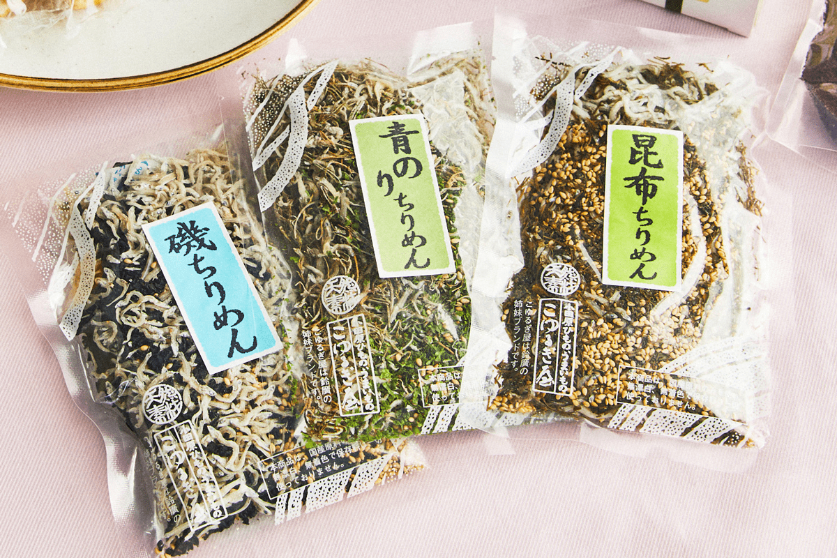 鈴廣の姉妹ブランドこゆるぎ屋の「昆布ちりめん」「青のりちりめん」「磯ちりめん」は海の幸の旨みをぎゅっと感じられるちりめんです。おにぎりのふりかけとして、豆腐やサラダに、パスタ等にもお使いください。すべて天然素材のみでお作りしているので、自然なやさしい味わいです。