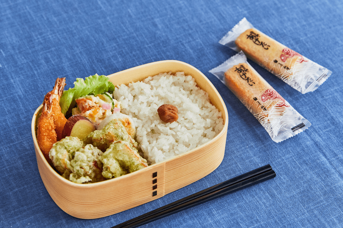 今回の百年ちくわの磯辺揚げ弁当には、鈴廣の「金目鯛のあげたい」、「ひょっこり焼き」「小梅(梅干し)」も詰めました。