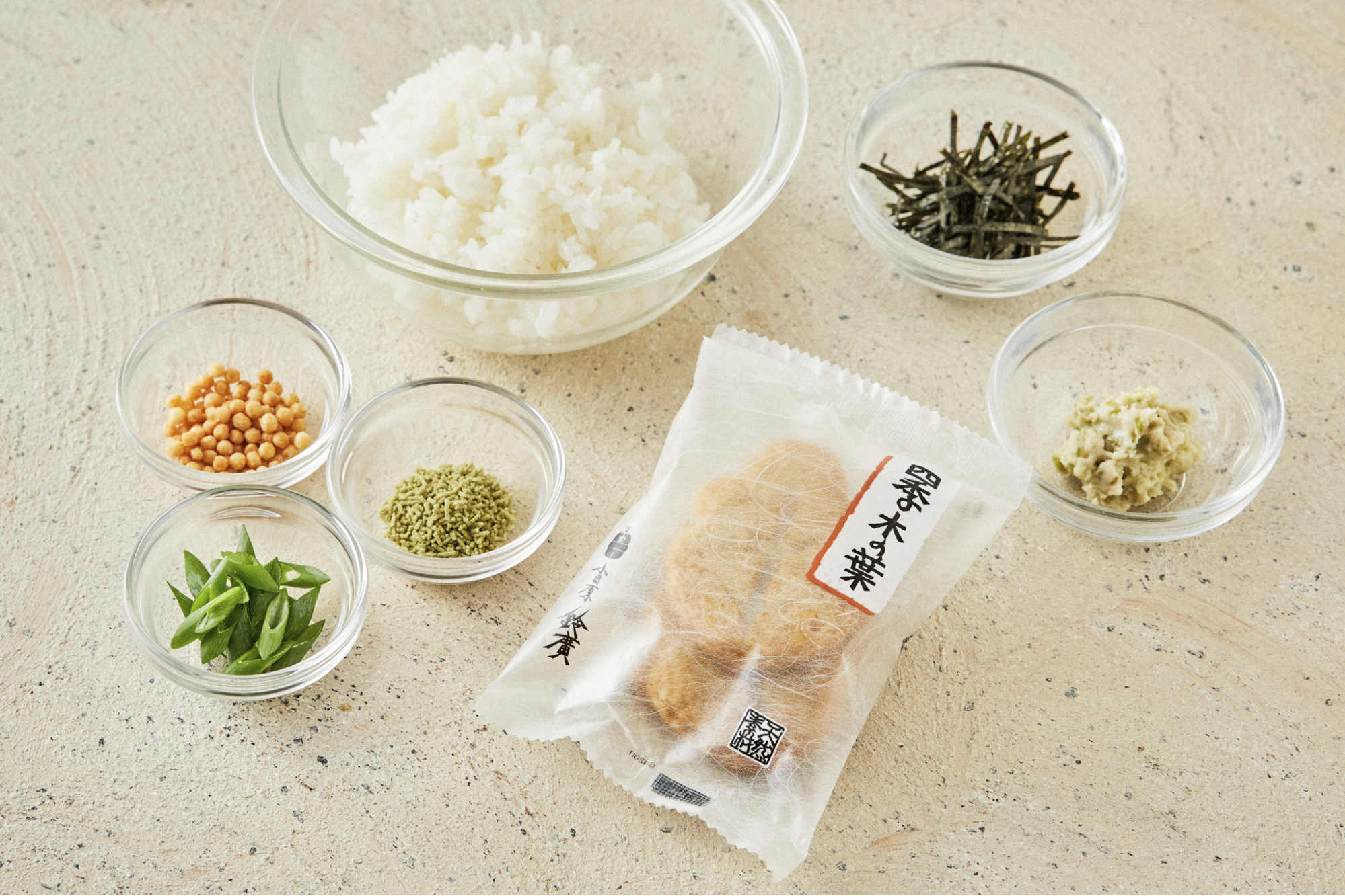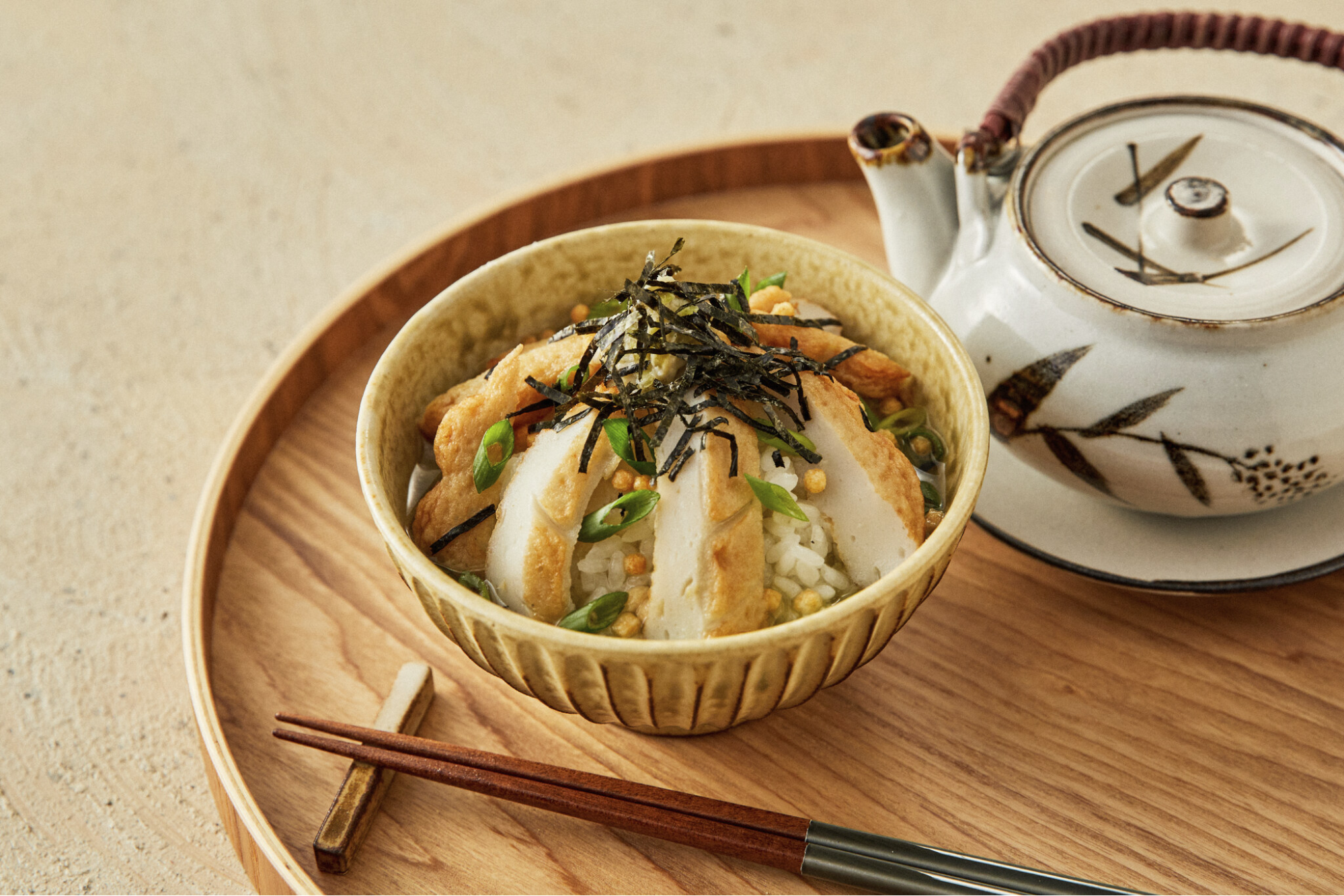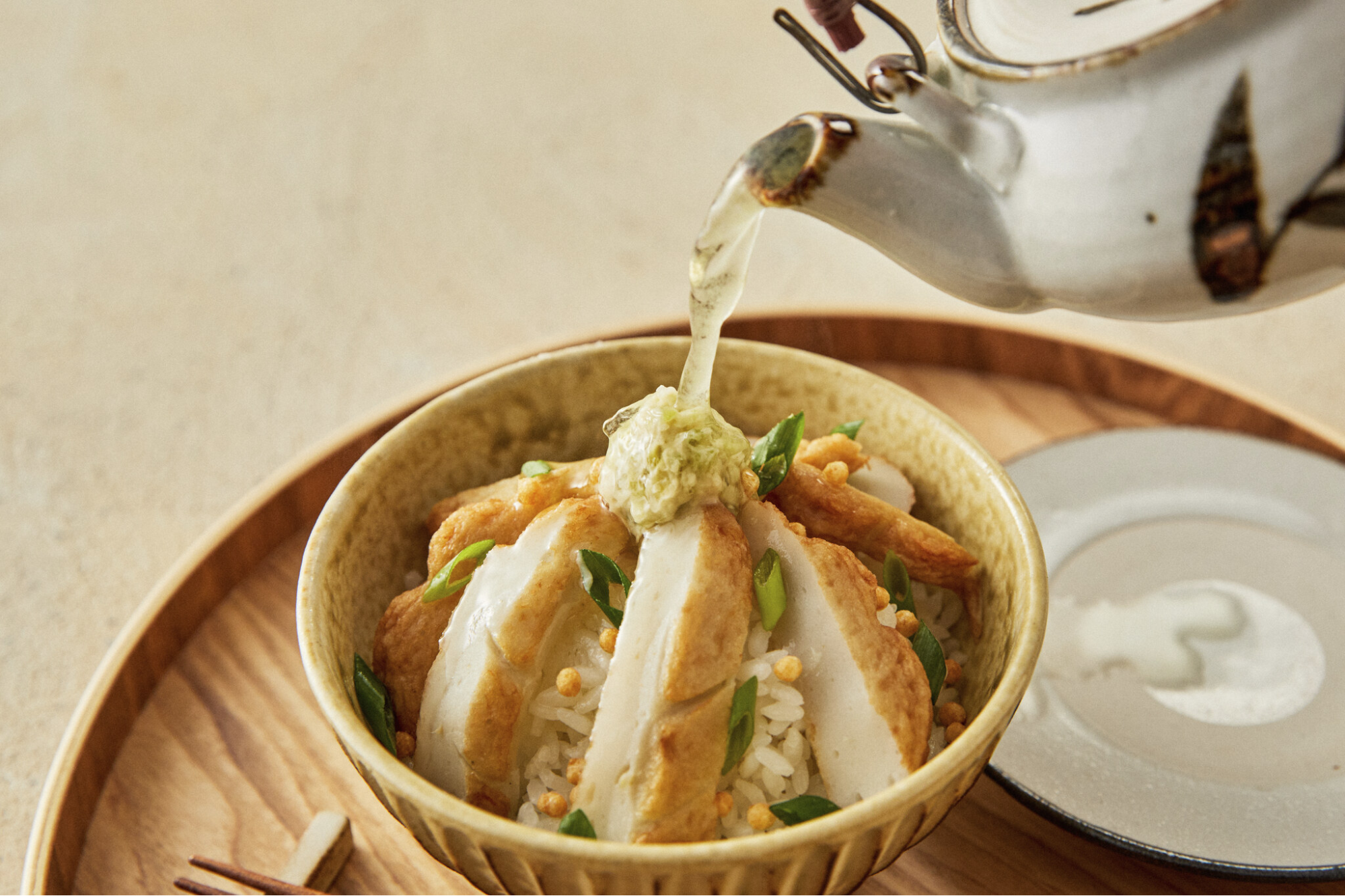 ごはんと出汁のシンプルな土台に、白身魚のぷりぷり揚げかまぼこを豪快にのせました。薬味には秋ネギやわさび漬けなど、自分流でたっぷりどうぞ。