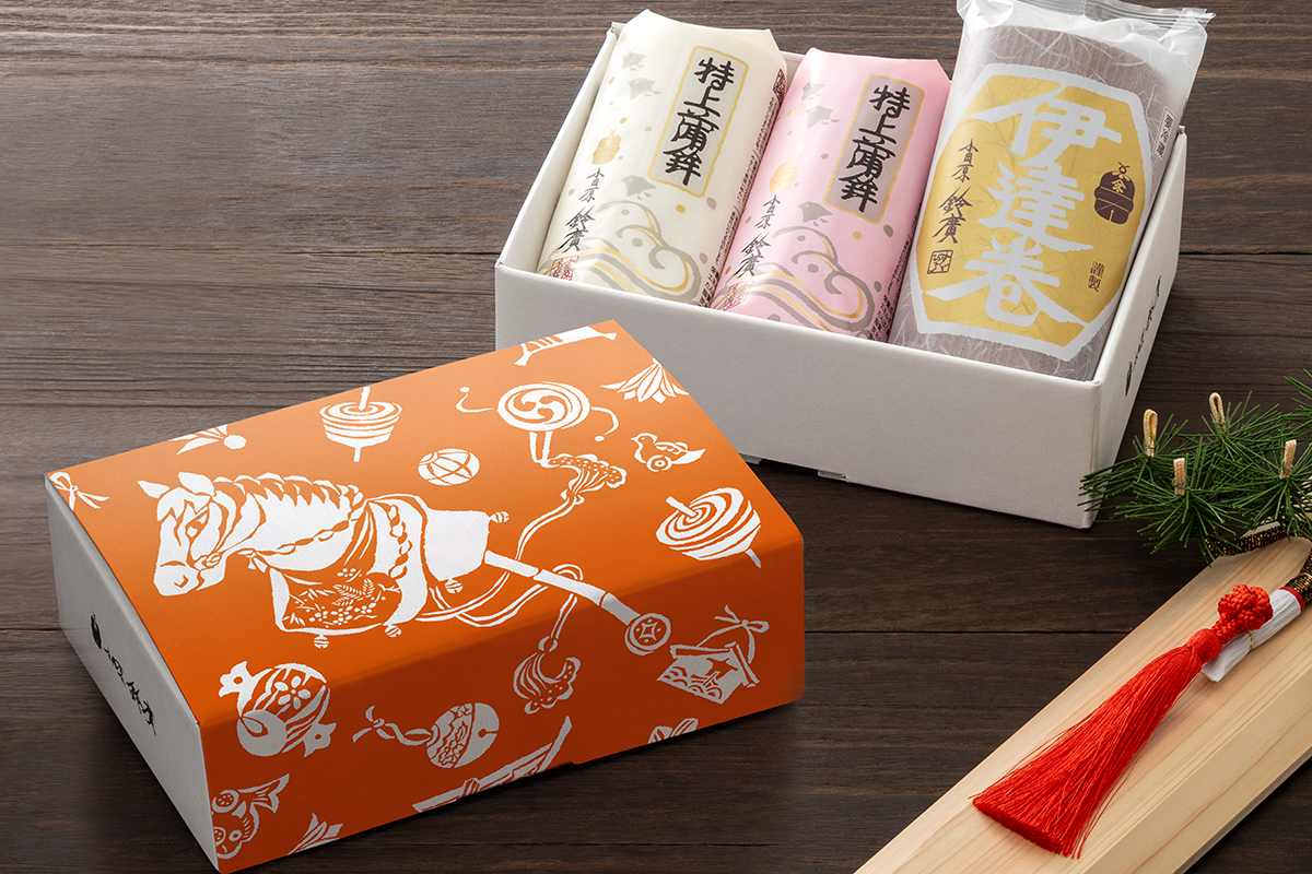 冬の贈答でもっとも人気なのは、紅白かまぼこと伊達巻の詰合せ「松寿」と「ちどり」です。お正月に喜んでいただけると、毎年贈られる方も多くいらっしゃいます。
