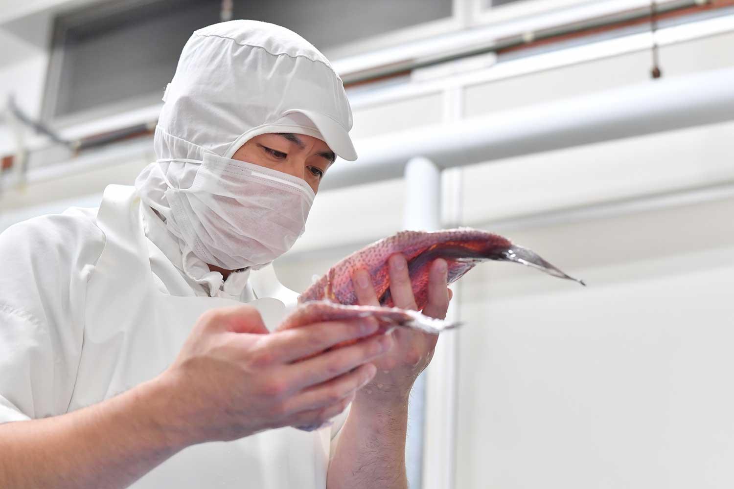 「5年ほど前から、資源が減ってきたのか、気候の関係か、魚のコンディションが不安定なんです。今は採肉には基本的に機械を使っているのですが、魚のサイズや鮮度にばらつきがあるとそれに合わせて微調整が必要です。1日のうちでも魚種やサイズ、鮮度が違うことがあるので、見分ける力がないとこの工程は務まりません。」