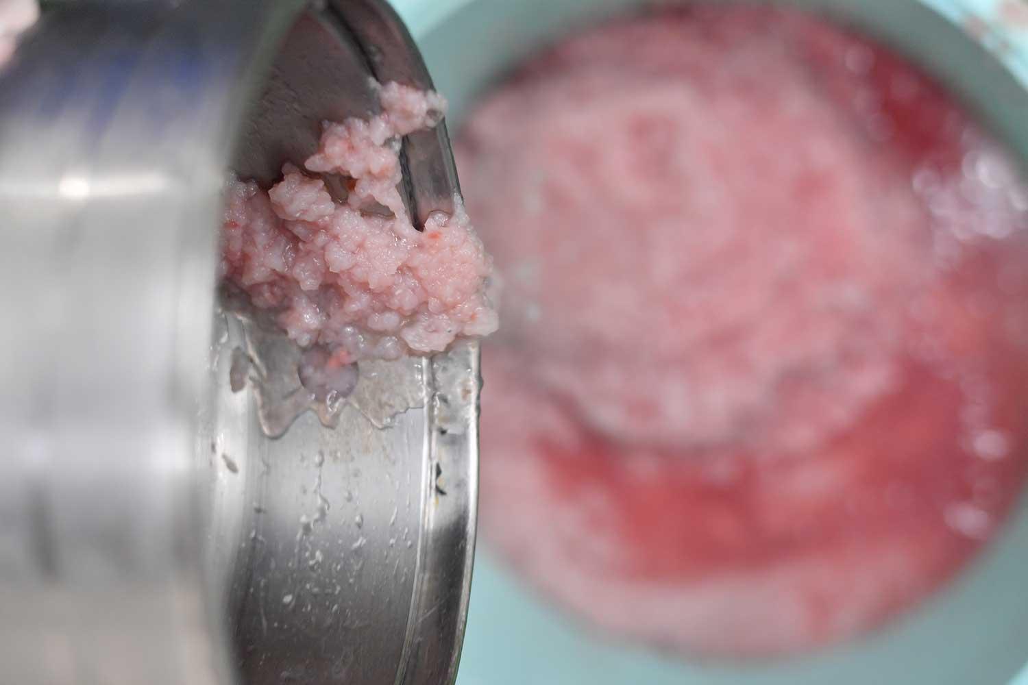 日本酒が精米歩合によって味や値段が違うように、かまぼこも魚の採肉度合いにより品質が大きく変わる。魚は皮目付近に脂が多いため、採肉度合いが多すぎると臭みが強く出たり、ふわついた身になってしまう。逆に少なすぎると使える身まで捨てることになってしまいコストがかさむ。中心付近にある65〜70%の良質な身だけを採取するのが理想だが、これも、魚種や魚のサイズ、鮮度など、その時のコンディション次第で変わるというから難しい。