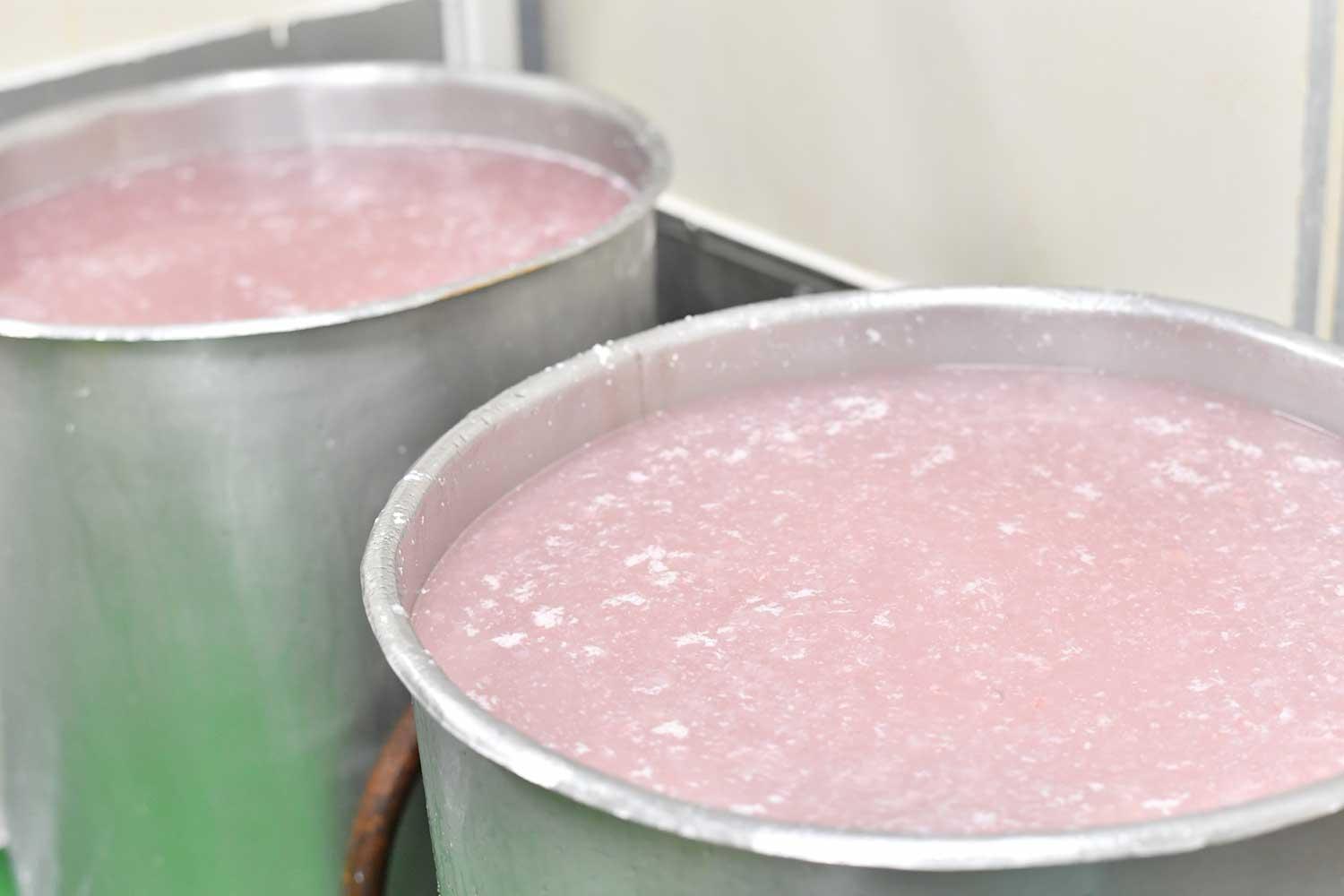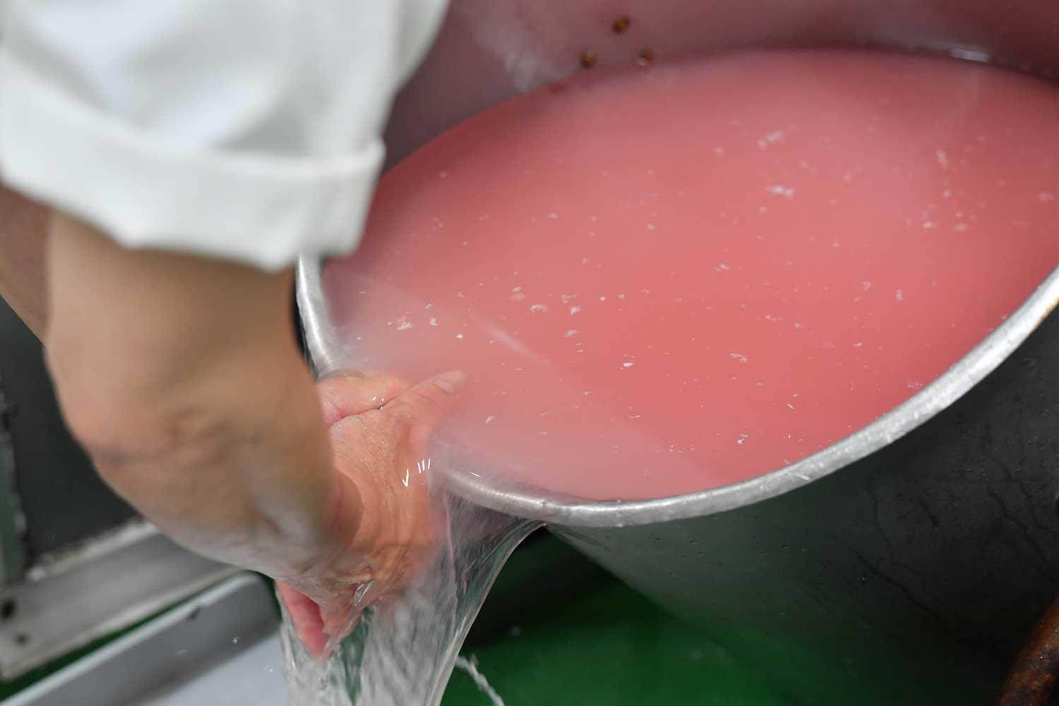写真上:水晒しを繰り返し、水が白く透明になっていく