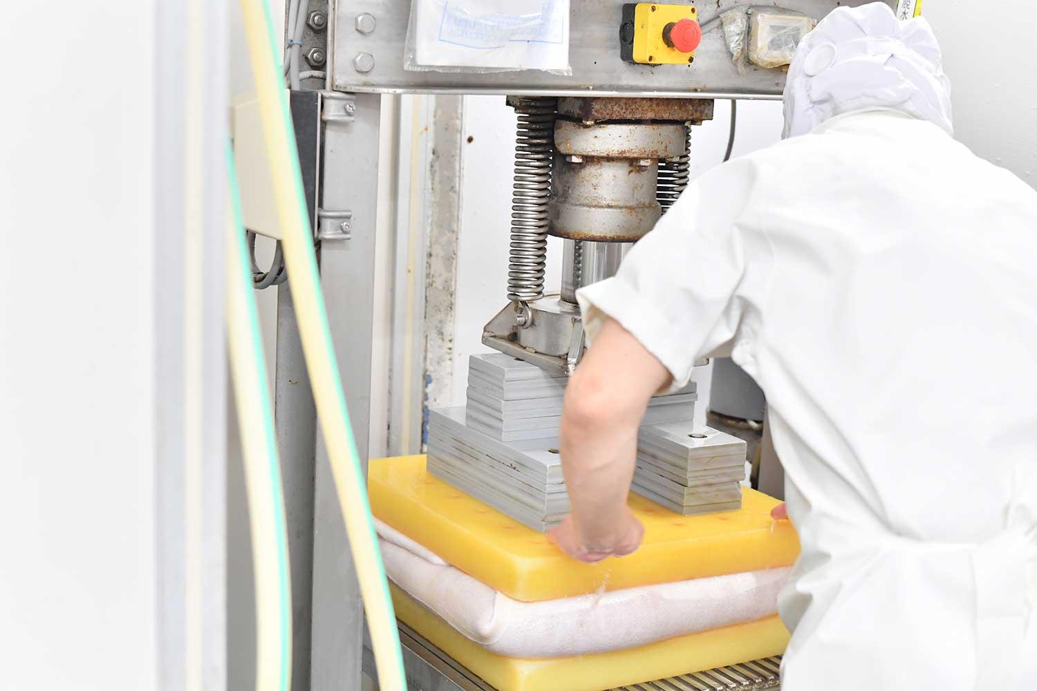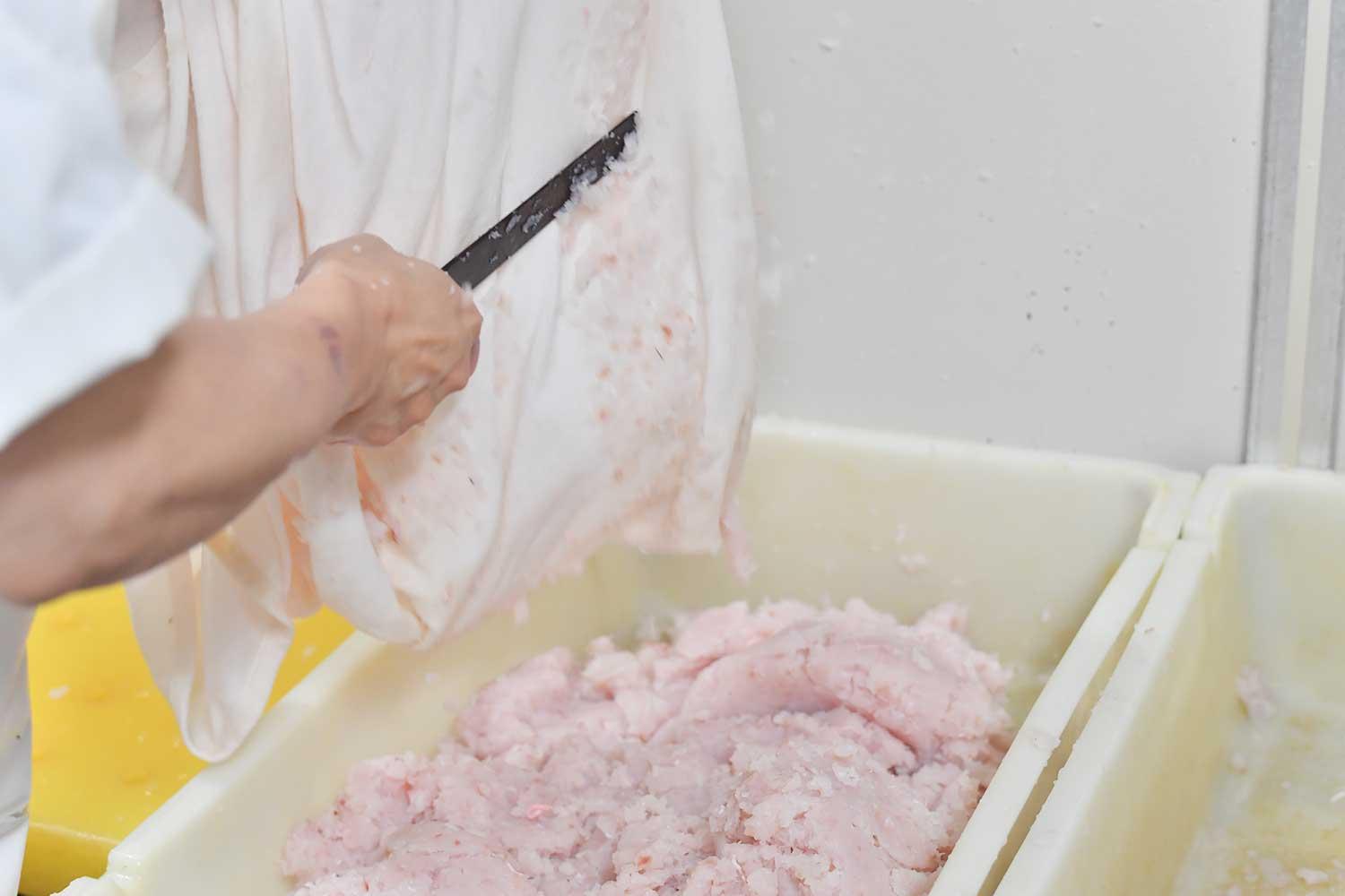 「脱水」は、その名のとおり水晒しした魚肉を、水分を適度に残して、脱水する工程だ。魚の身に残る水分の割合は、かまぼこの弾力やしなやかさに大きく影響するのだが、その誤差はというと、すり身に残る水分量が0.1%違うだけで弾力が変わってしまうというレベル。しかも、魚種や産地、季節や大きさによって魚が蓄えている水分量は異なるため、毎回絞る加減を変えるだけで狙った水分量に調整するのは困難を極める。