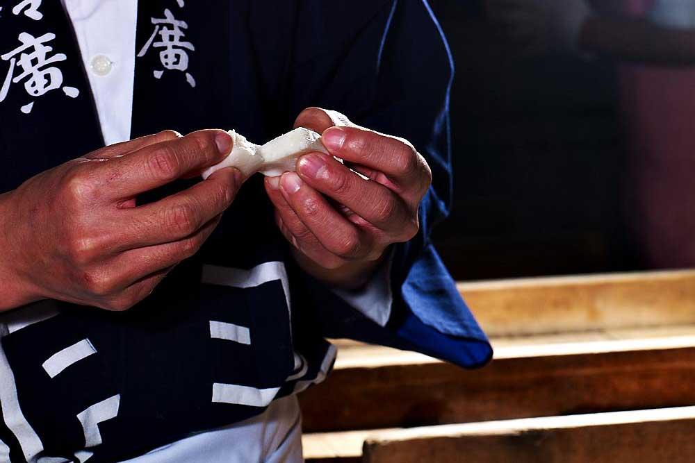 「まずは、全体から指で感じる弾力の強さ、指で割いてみたときの裂いた面の凹凸、表面のツヤを目で見ます。その後、口に入れて粘りときめの細かさをチェックします。前歯で小さくかじる程度で瞬時に判断しなくてはならず、しかも、最終段階の冷えた状態ではなく、蒸したままの熱いものなので、完成をイメージしながら行うのが難しい。熱く、裏ごしをしていない状態は、製品になった時の官能検査とはまったく異なる感性と基準をもっていなければならないんです。」
