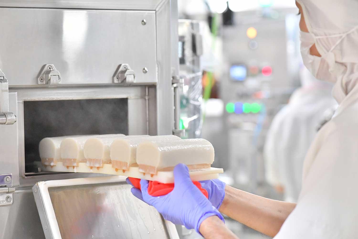 現在はマネージャーとしてライン製造課をとりまとめている葛西は、品質の向上や生産の効率化を追求しながら、伝統製造課での貴重な体験をもとにライン製造に命を吹き込み、かまぼこづくりの理想形を模索し続けている。