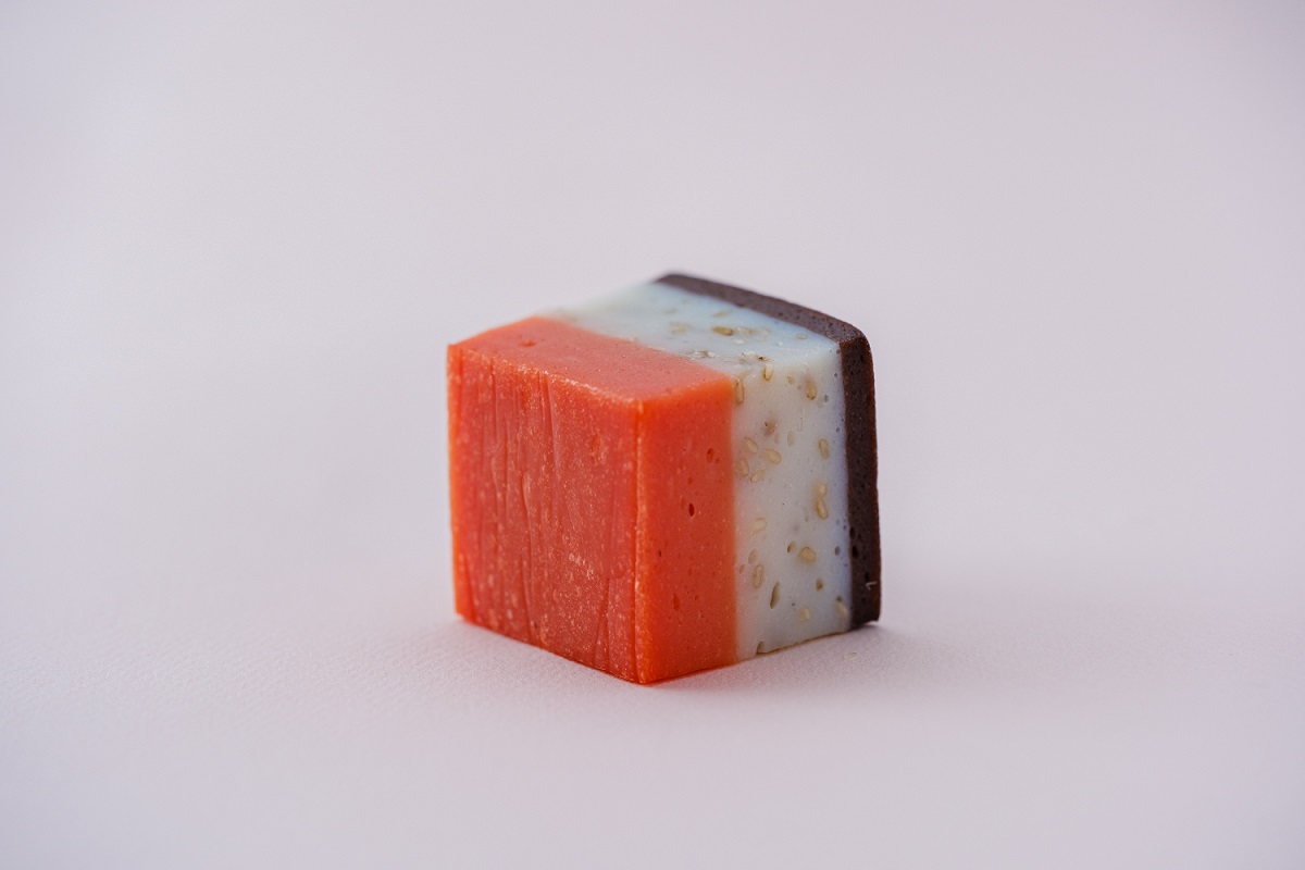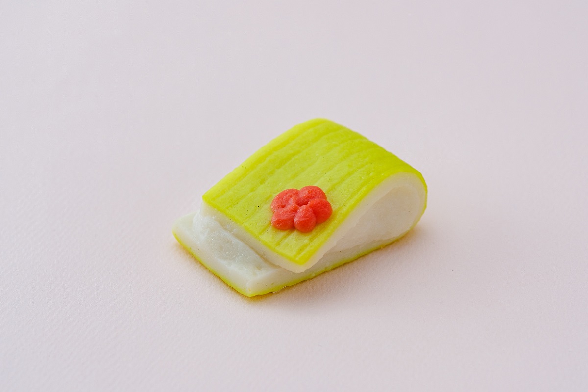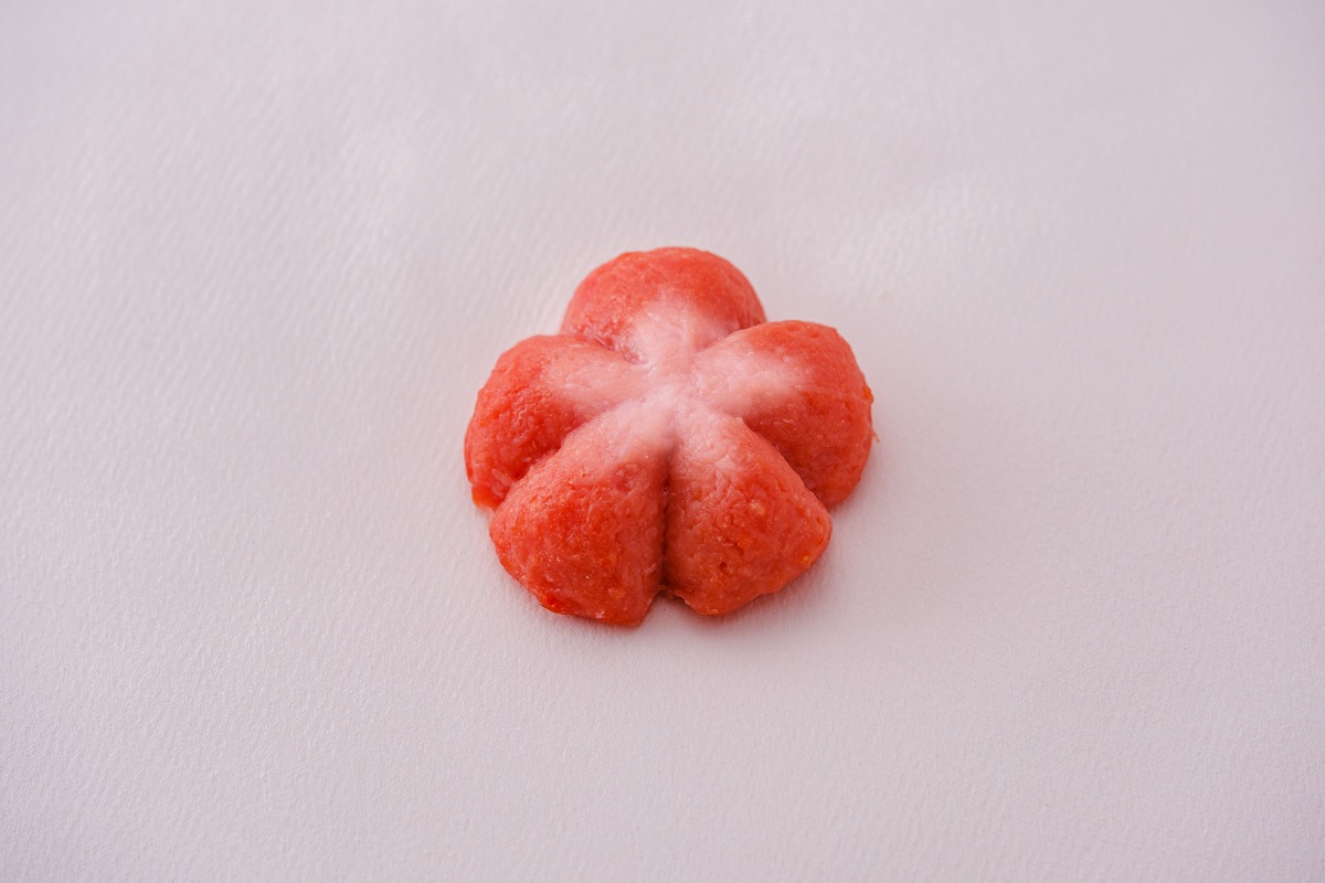 「4種類の細工蒲鉾をお皿に並べたときに立体感が出るよう、高さを意識しました。他が丸みを帯びたフォルムのなか、シンプルで直線的なこの形はアクセントにもなりますよね。色で紅白の梅とその枝を表現しており、白の層にはゴマを、茶色の層にはさらしあんを混ぜ込むことで、味と食感に変化を出しています」