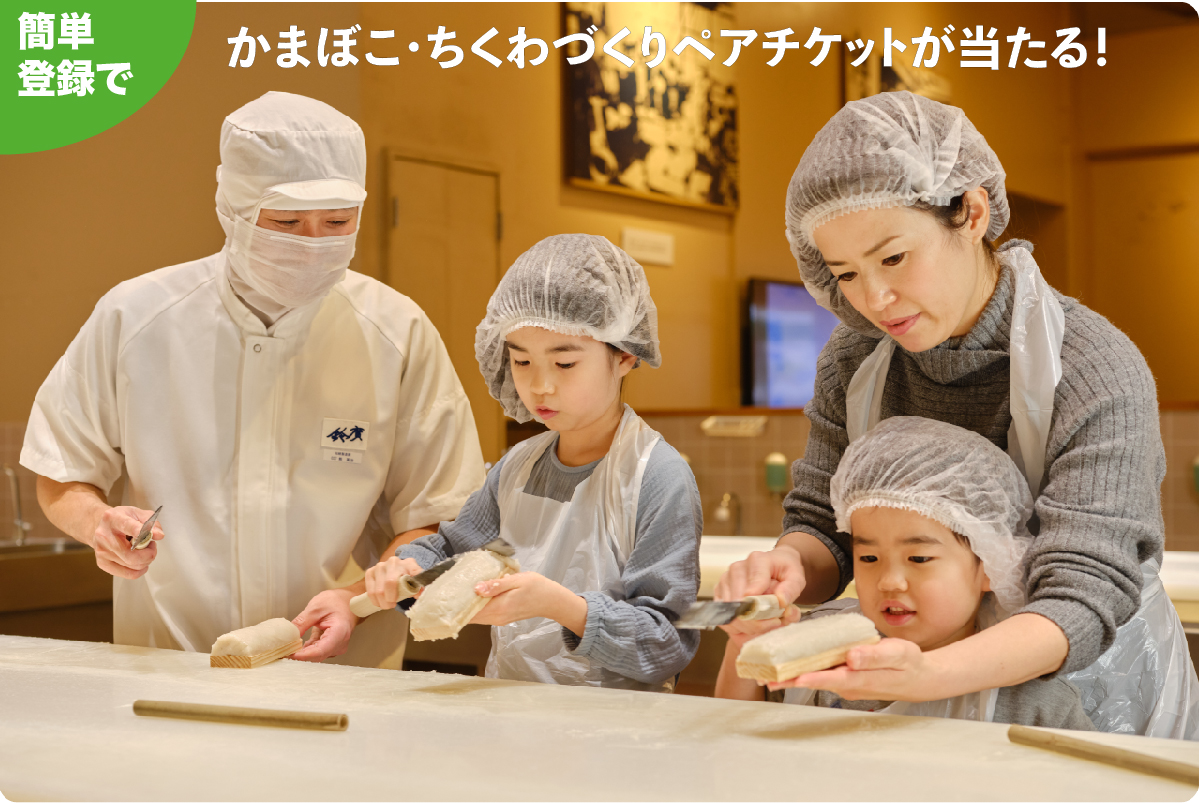 抽選でペアチケット 30組様へかまぼこ・ちくわづくりの体験が当たります。