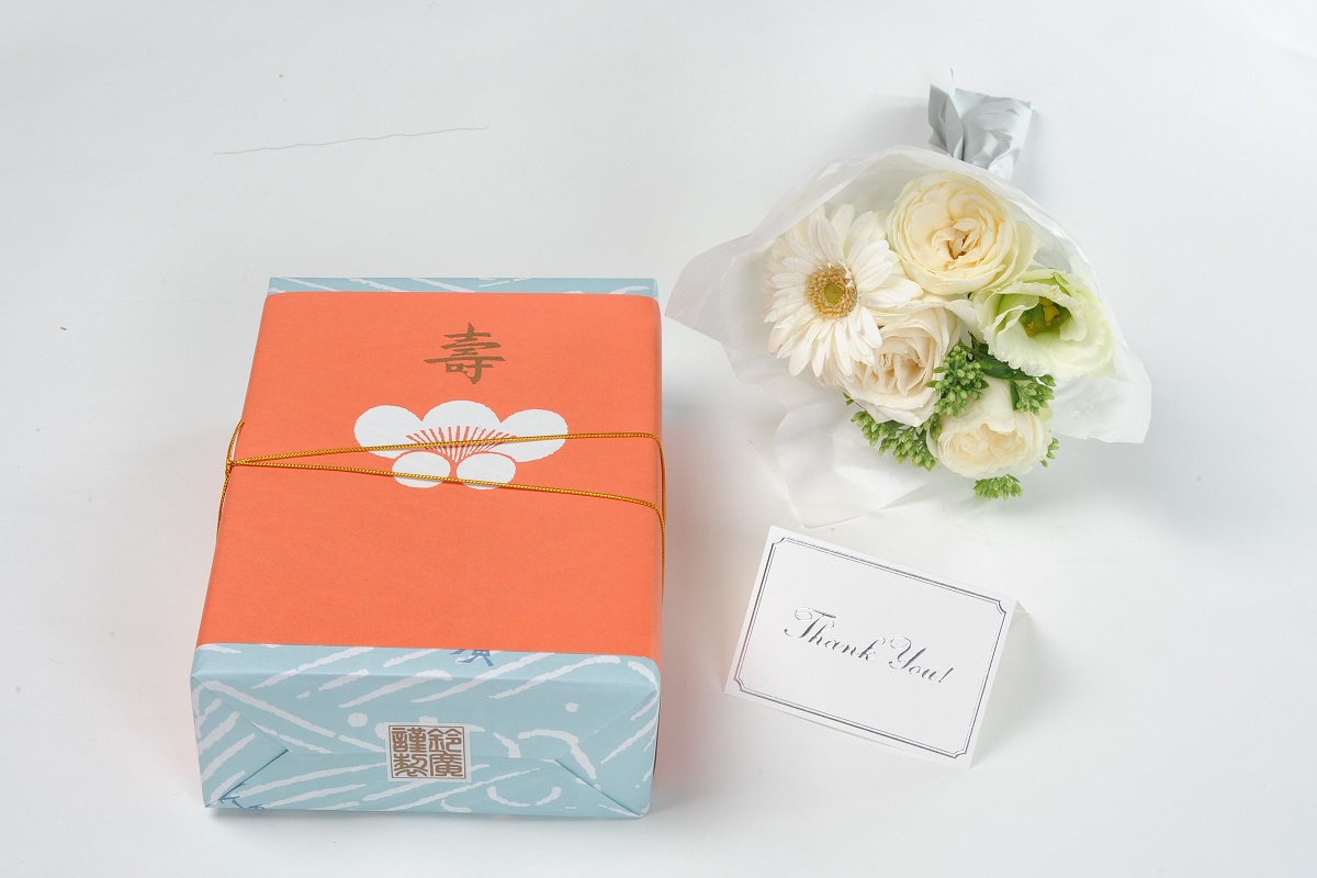 内祝いの品物を贈る場合、熨斗は紅白の蝶結びにします。表書きには「内祝」「還暦内祝」「寿」のいずれかを書き、フルネームで名前を書くのが一般的です。ただし、贈る相手が喪中の場合の表書きは「御礼」とします。また、品物と一緒にお礼のメッセージカードを添えると、より感謝の気持ちが伝わります。
