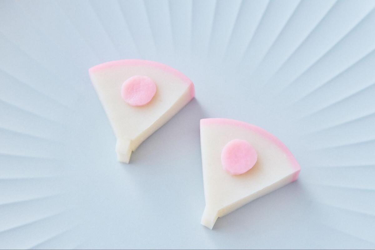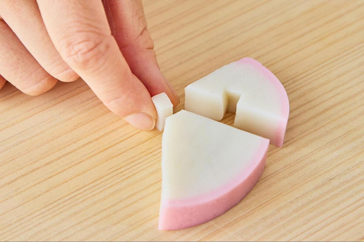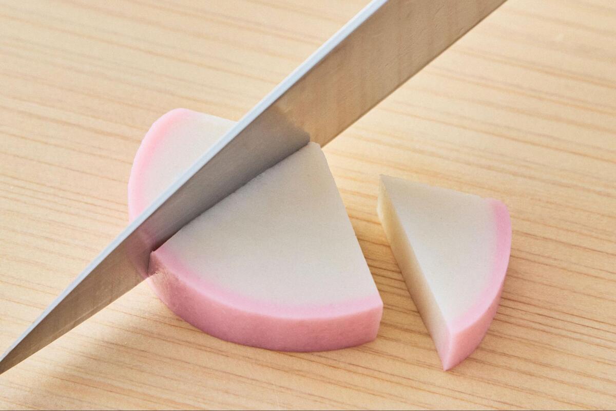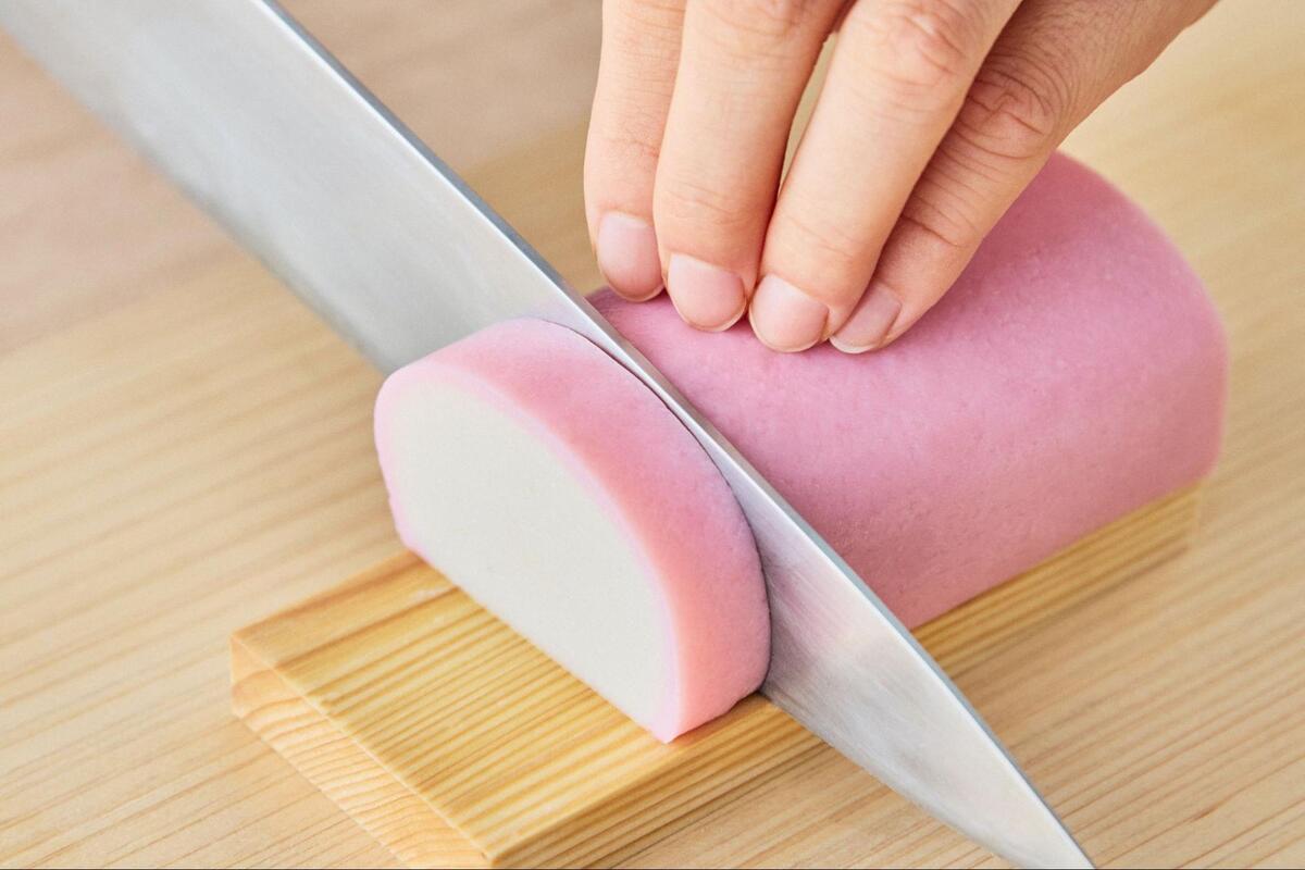 今回、飾り切りに使用したのは「特上蒲鉾」。日本近海のグチをメインに、地元相模湾のオオギスなどをブレンドし、小田原の工場で職人たちが石臼と杵ですり上げます。