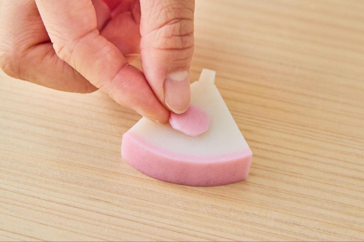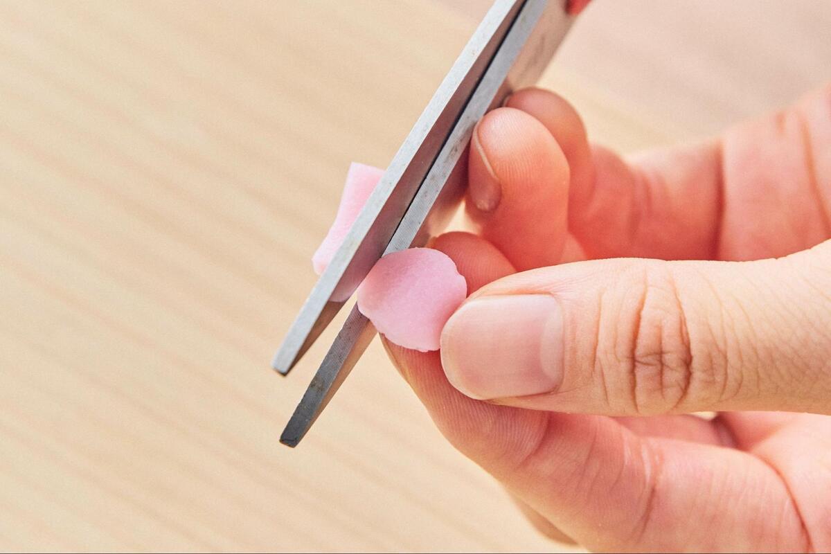 ④かまぼこのピンク部分を切り、ハサミで丸の形にする。