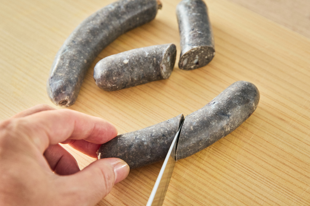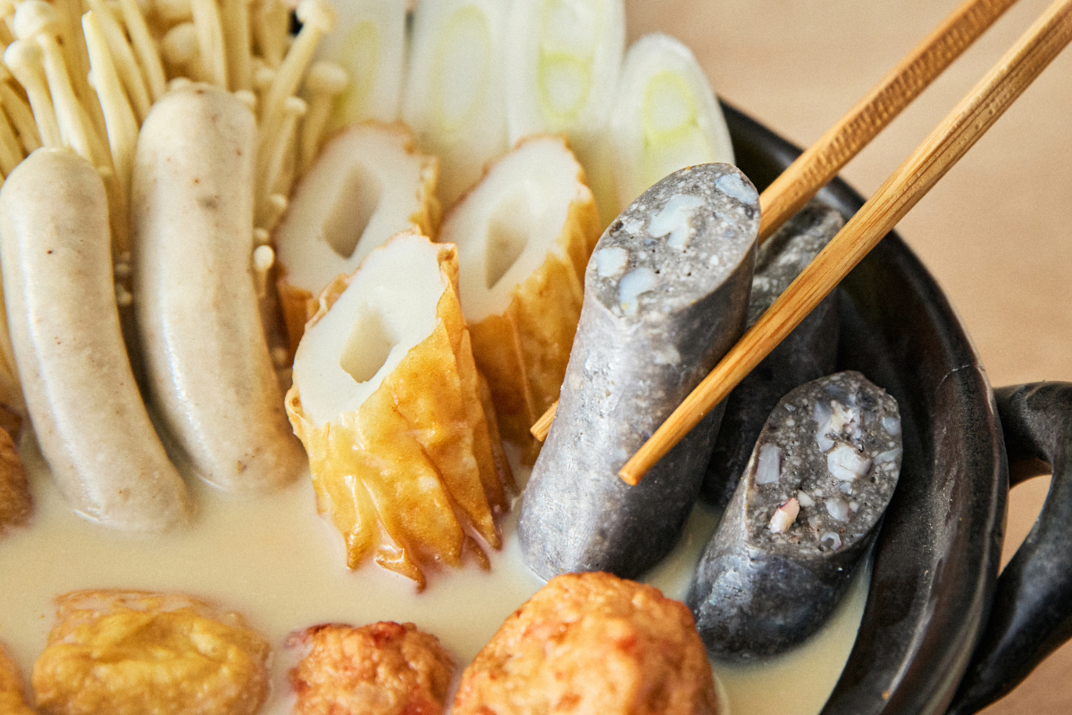 おでんの変わり種としておすすめなのが「シーフランク」です。粗挽きの魚介フランクフルトで、白身魚のすり身に、海老やホタテ、イカをごろごろと混ぜ、羊腸に詰めています。贅沢な食感と魚介の旨みが身上で、おでんはもちろん、シチューやポトフにもよく合います。