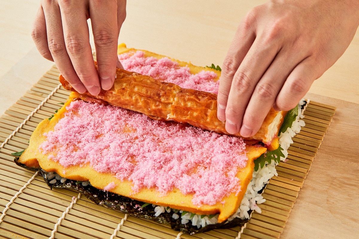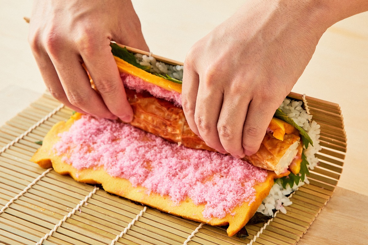 ②海苔にご飯を薄く広げ、1で切った「海のすふれ」、桜でんぶ、大葉を乗せ、真ん中に「百年ちくわ」を置く