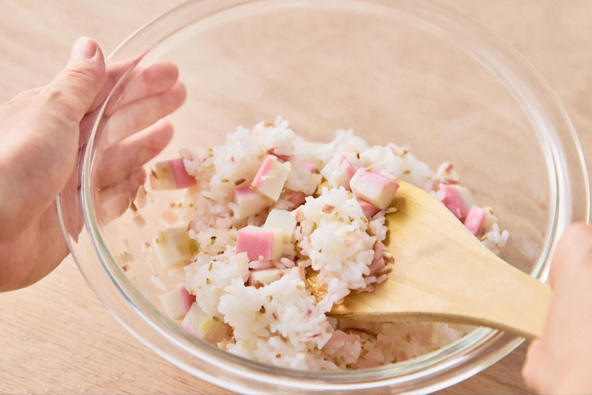 ③  ごはんが炊けたらすし酢を混ぜ込む。冷めたら②のかまぼこ、椎茸、紅しょうが、みょうが、白ごまを加えて混ぜる。