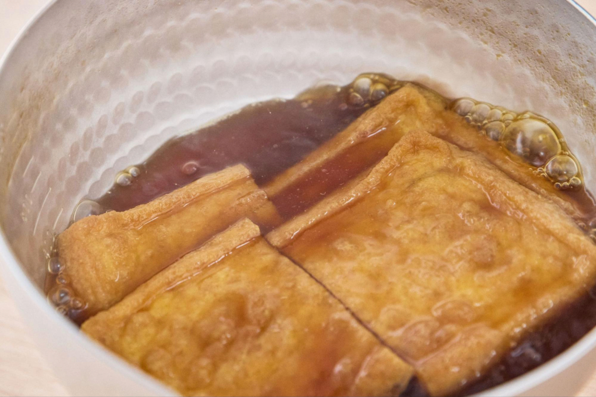 ①  油揚げを半分に切り、しいたけと一緒に、水、砂糖、醤油、みりんで10分ほど炊く。