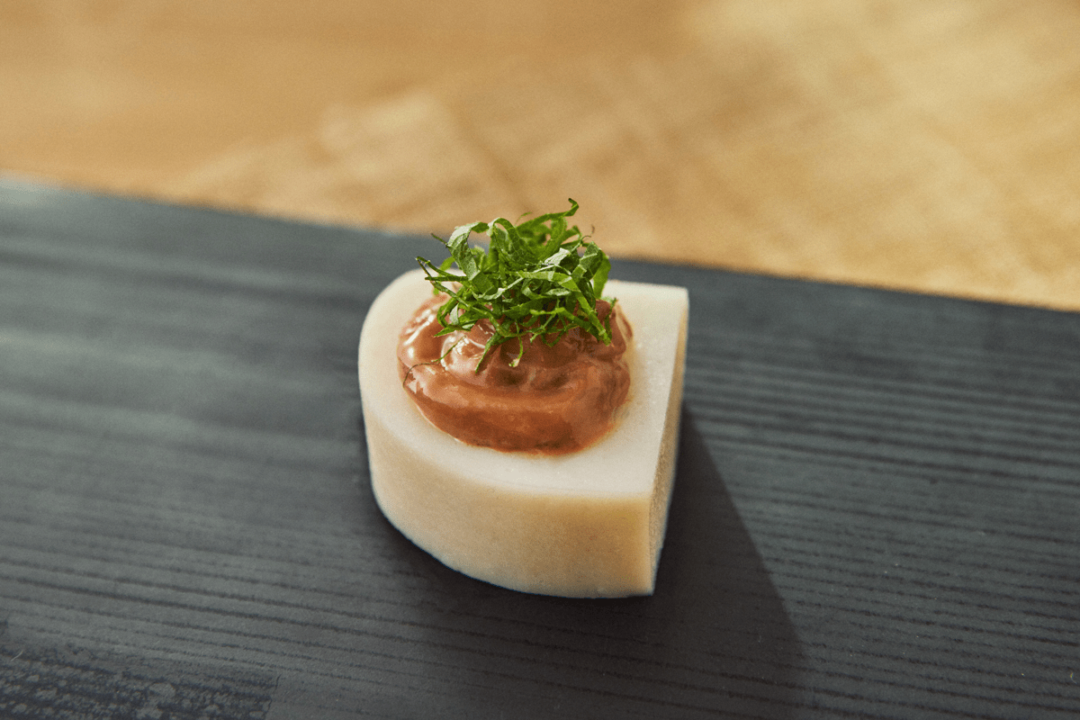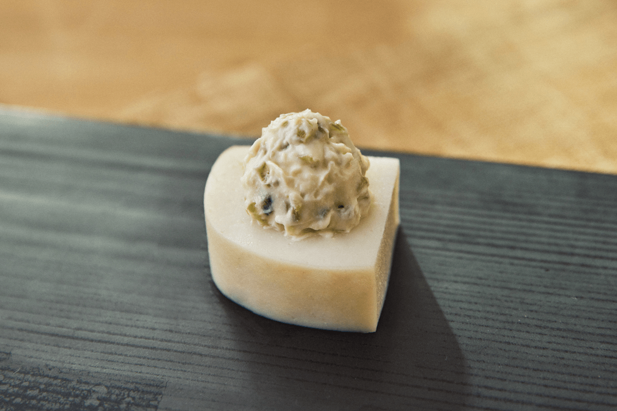 日本酒にあう板わさには、塩辛や味噌などの発酵食品をちょびっと添えてください。日本酒の旨みや甘みを、発酵食品のしっかりとした味がより引き立ててくれます。