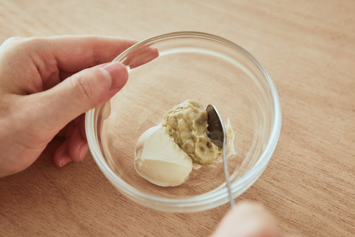 ③ 赤味噌と小口切りにしたねぎを混ぜる。*ねぎは少し飾り用にとっておく
