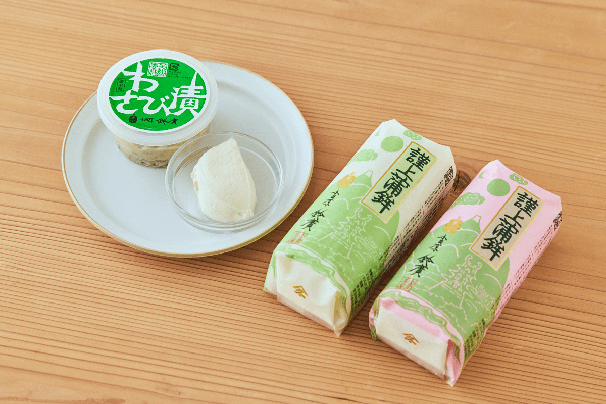 わさび漬:しゃきしゃきと粗めに刻んだ山葵と灘吟醸の酒粕で仕込んだわさび漬けです。