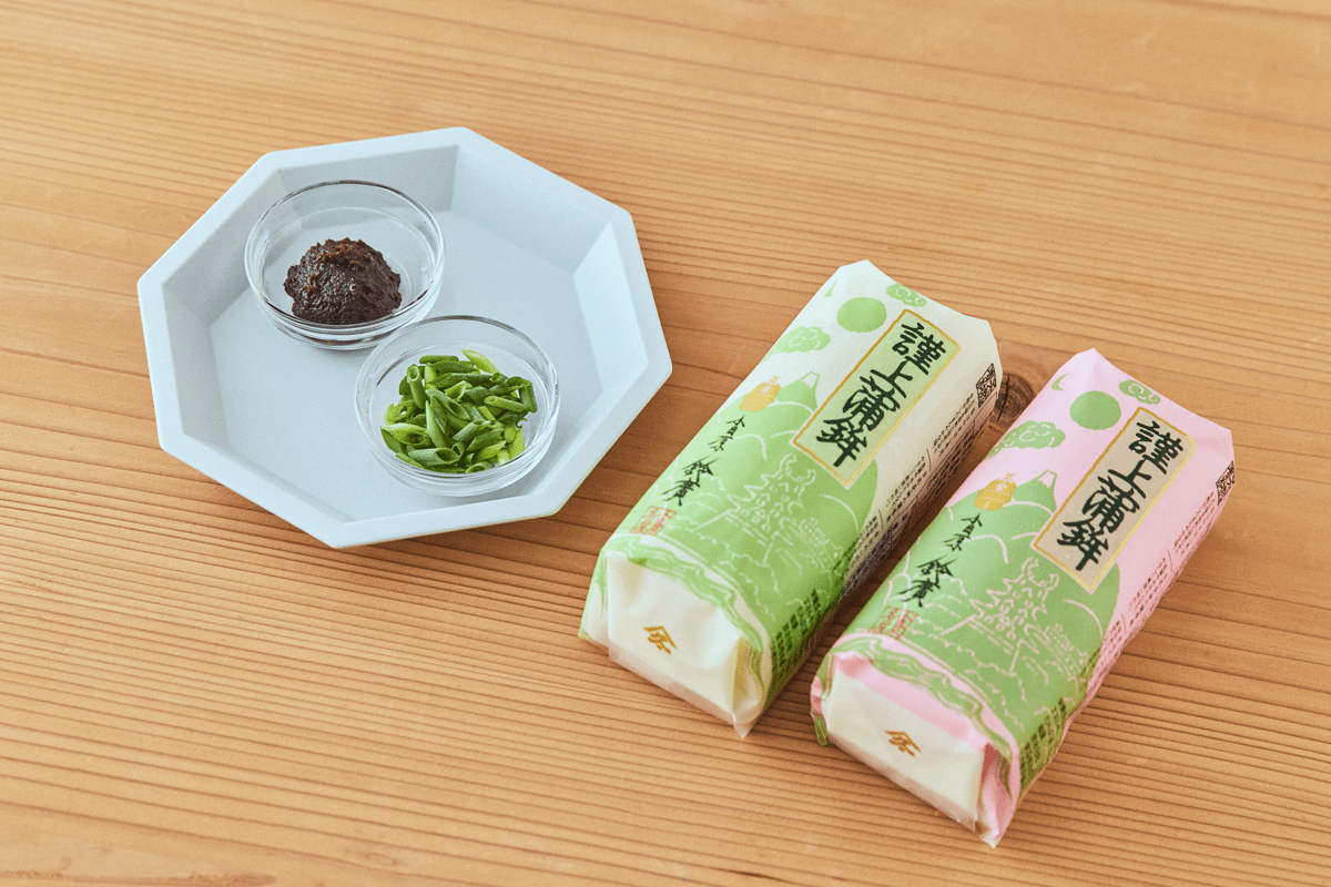 ④ ①のかまぼこの上に③のねぎ味噌をのせ、最後に②のねぎを飾る