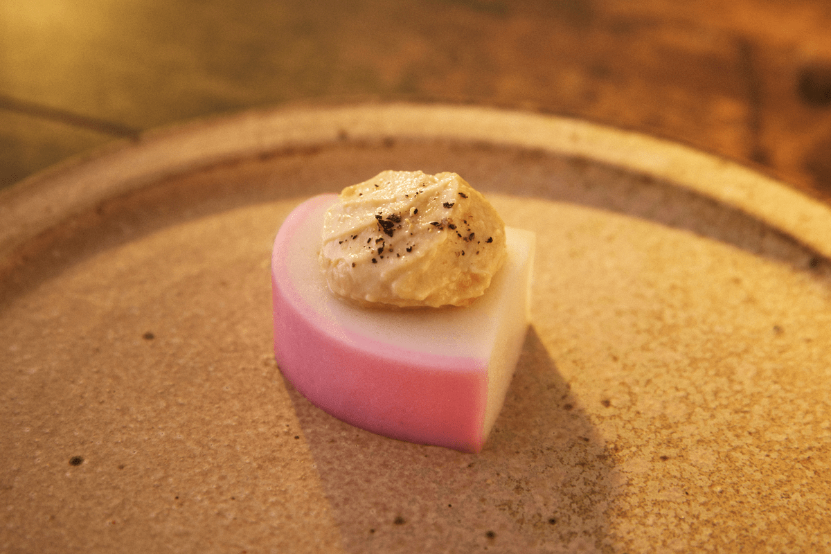 ② 味噌とクリームチーズを混ぜ合わす。①のかまぼこの上に②の味噌クリームチーズをのせ、最後にブラックペッパーをかける。