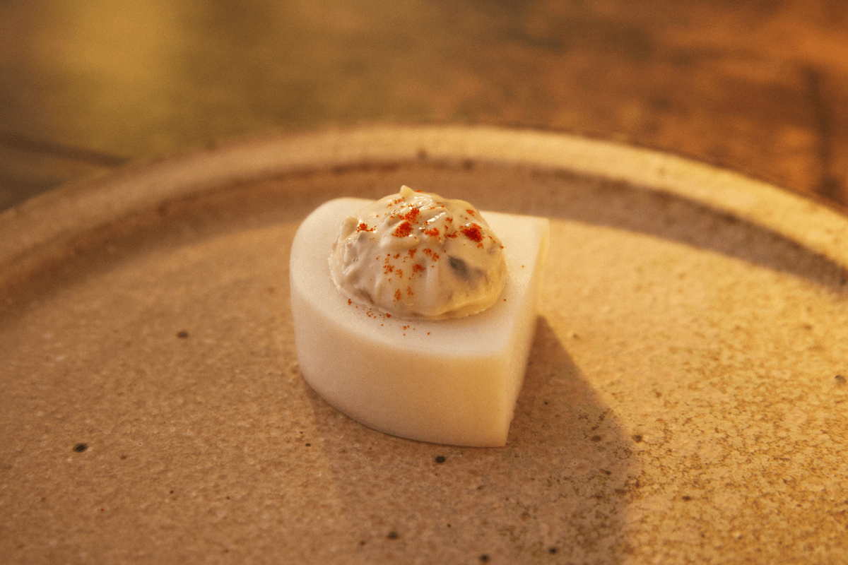 ④ ①のかまぼこの上に③のアンチョビマヨネーズをのせて、最後にパプリカパウダーをかける