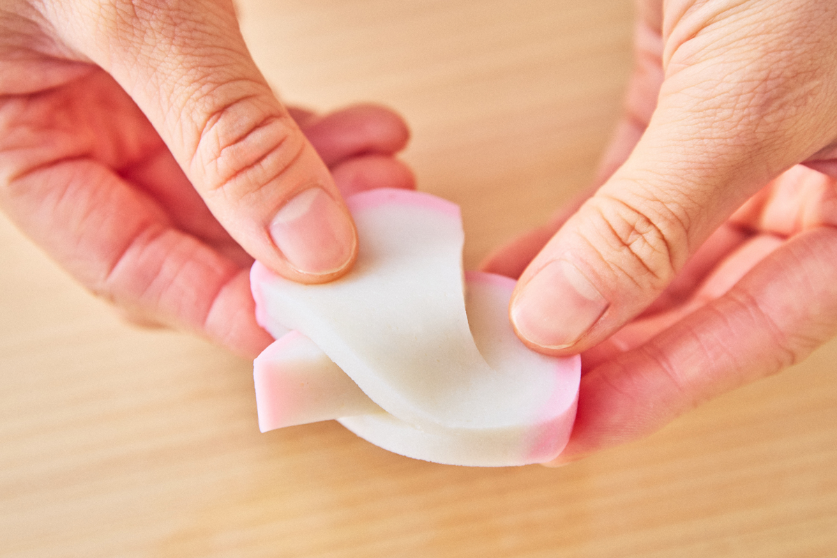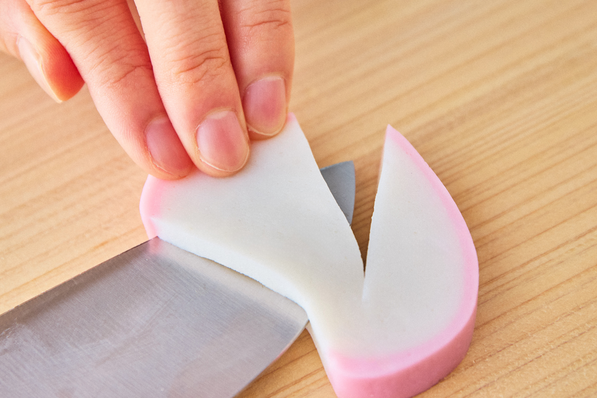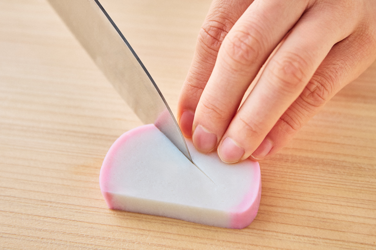 今回、飾り切りに使用したのは「特上蒲鉾」。日本近海のグチをメインに、地元相模湾のオオギスなどをブレンドし、小田原の工場で職人たちが石臼と杵ですり上げます。