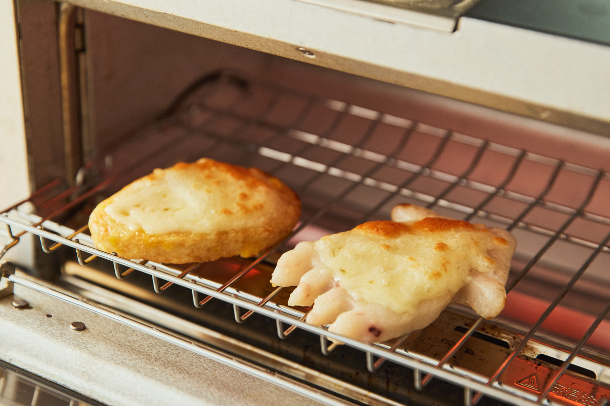 ② オーブントースターで500W(180℃)で3分ほど、チーズがとけて少し焦げ目がつくまで焼く。