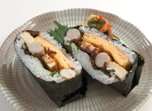 今回はシソの葉や佃煮で香と旨味をプラス。厚揚げと卵焼きでボリュームもプラス。食べ応えもある美味しいおにぎらずになりますよ。