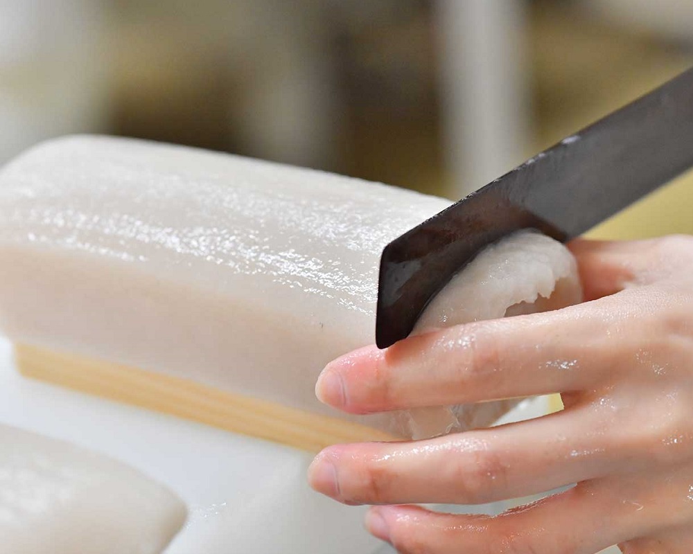 機械を導入しても自らの手で魚をおろし、素材の状態を見極めて、かまぼこづくりができる国家資格を持った職人を育て、職人技を次世代へ引き続いでゆきます。