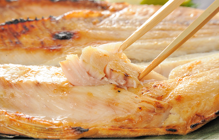 ここで、干物の上手な焼き方をご紹介いたします。「川魚は皮から、海魚は身から」といわれるように、まず身から。中火の遠火で焼き網を熱くしてから網にのせます。七分ほど火が通ったら裏返し、皮は軽くあぶる程度で焦がさないことが肝心です。 魚の身から油が音を立てながら出てくるようになれば食べどきです。