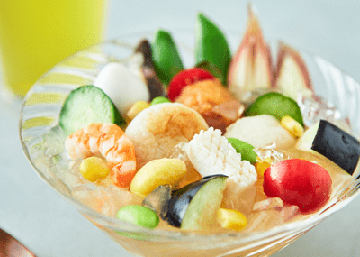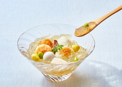 ひんやりぷるぷるのジュレタイプの出汁の中に、色とりどりの具材がたっぷり。暑くて食が進まない…