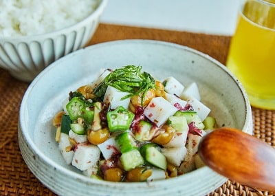 梅干しと大葉、オクラに胡麻。 さっぱりとした和え物にかまぼこを加えると、ぷりっとした弾力…
