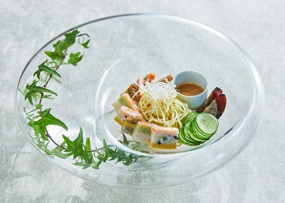 暑い日にささっと贅沢冷麺。 海老やカニ、穴子などを白身魚のすりみに重ねた「海山のおーどぶ…