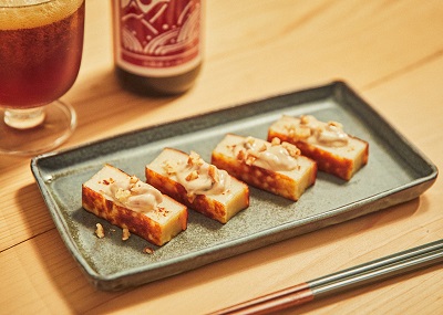 「やき角」をこんがりふんわり焼いて、上に塩辛クリームチーズをのせた一皿です。 かまぼこと…