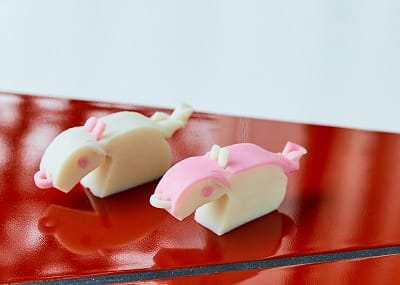 縁起の良い紅白かまぼこで「蝶(ちょう)」を作ります。 古くから吉祥文様として着物等に描か…