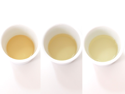 色の違いは熟成期間の違いによるものです。まさに、ワインのビンテージと同じで、一番濃い色のみりんは、超特選蒲鉾「古今」などの板蒲鉾に使用しています。
