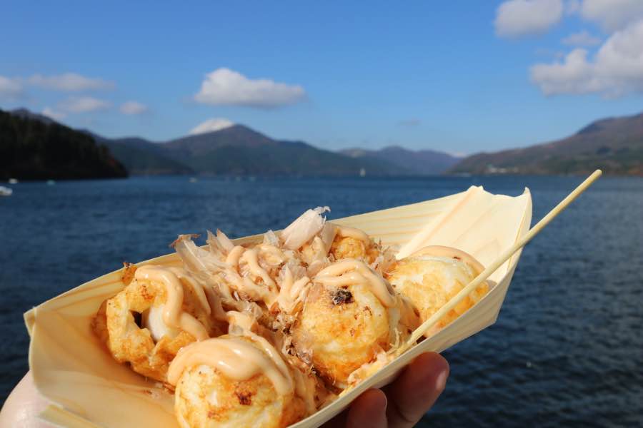 At Hotoriya, Suzuhiro`s Lake Ashi shop, you can enjoy a plate of special Takoyaki. Takoyaki is a grilled seafood dumpling of fresh octopus wrapped in fluffy surumi.