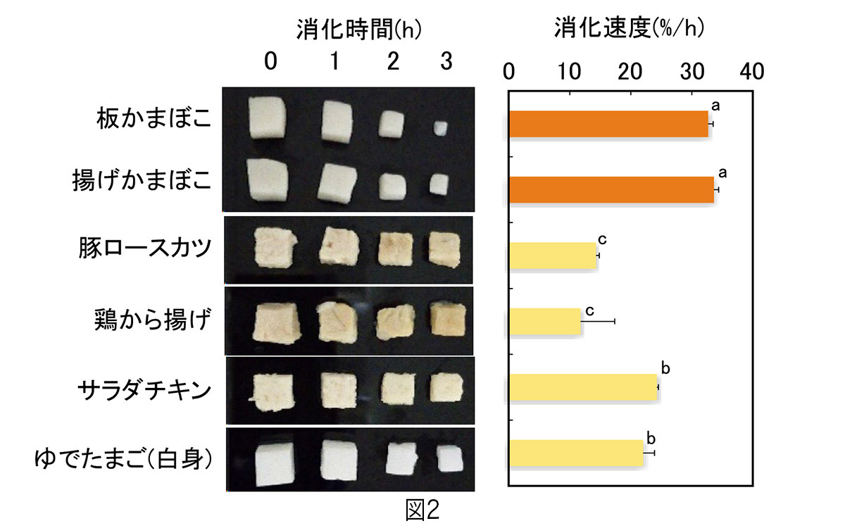 各食材を同じサイズに切り出して人工胃液(ペプシン溶液)で消化し、その消化速度を消化性の指標とした。