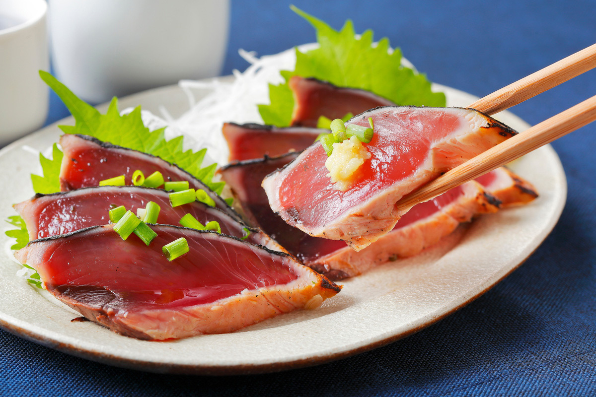 春が旬の初鰹は 身が引き締まっていて脂は少なめ。 赤身が多いからさっぱり食べられるので、たたきにして食べるのがおすすめです。薄くスライスしたカツオを軽くたたいてやわらかくし、醤油やわさび、生姜などの薬味と一緒に食べると、濃厚な味わいを楽しめます。