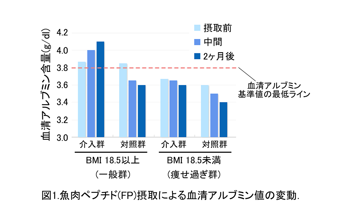 この研究の結果を図に示します。BMIが18.5以上(普通体型)の人が、魚肉ペプチドを摂取すると、基準値の下限(3.8g/dL)近くであった血清アルブミン値が上昇し、より良い状態に近づいていることが分かります。一方、魚肉ペプチドを摂っていない人では値が下がってしまい、低栄養状態が悪化してしまいました。