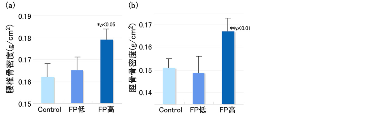 海綿骨が豊富な腰椎、および皮質骨が豊富な脛骨のいずれにおいても、FP高群はControl群に比べ、有意に(p<0.05)高い値を示した。