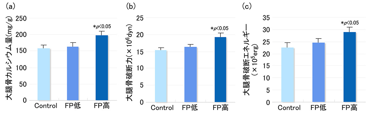骨密度との相関性が高い大腿骨中Ca量はFP高群はControl群に比べ有意に(p<0.05)高い値を示した。大腿骨破断力・破断エネルギーのいずれもFP高群はControl群に比べ有意に(p<0.05)増強効果を示した。