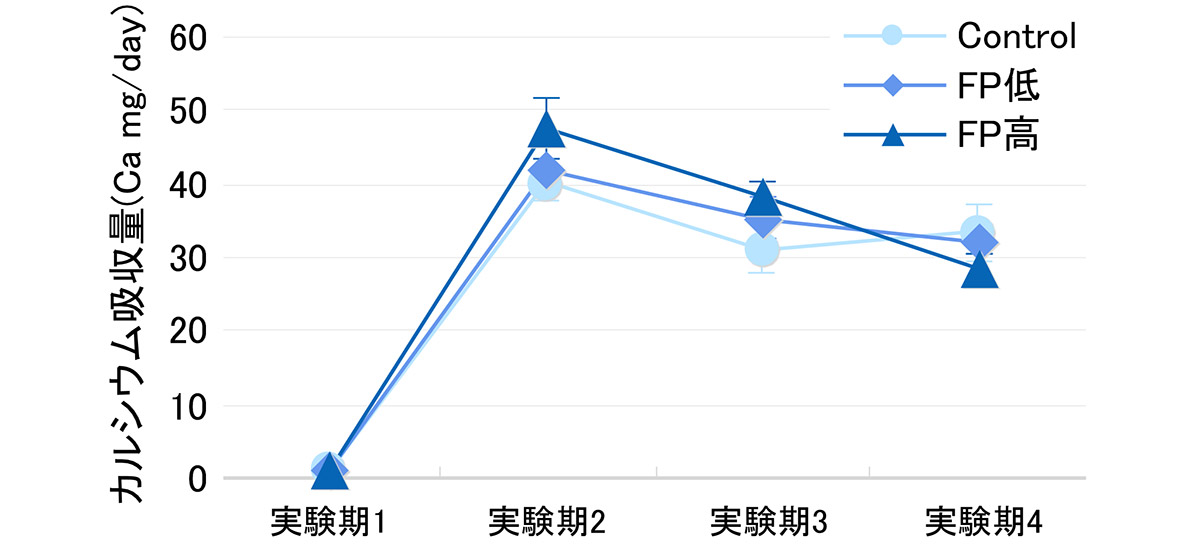 実験期1(試験食開始直前2日間)、実験期2(試験食開始後2、3日後)、実験機3(15、16日語)および実験期4(25日、26日後)にそれぞれステンレス製代謝ケージに入れ、24時間尿および糞を採取し、尿中および糞中Ca排泄量を測定した。試験食開始直後の2期および3期においてFP高群はControl群に比べ、高値傾向を示した。