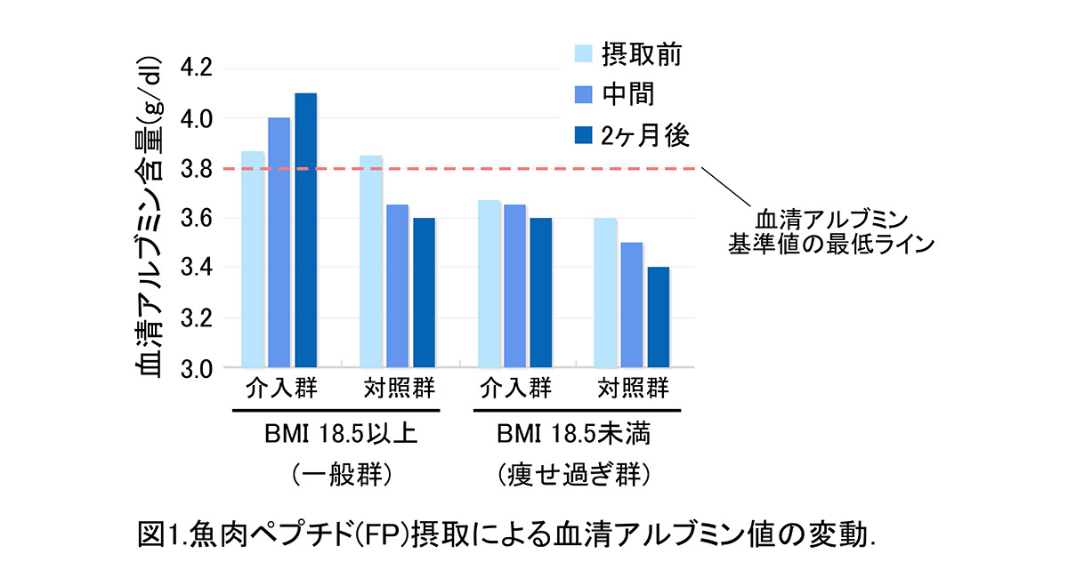 BMI(*)18.5以上の一般群では、対照群の血清アルブミン値が下がったのに対し、FPを摂取した介入群ではアルブミン値が増加した。BMI 18.5未満のやせすぎ群では、介入群は対照群と比較するとアルブミン値の低下が抑制された。介入群は対照群と比較するとアルブミン値の低下が抑制された。