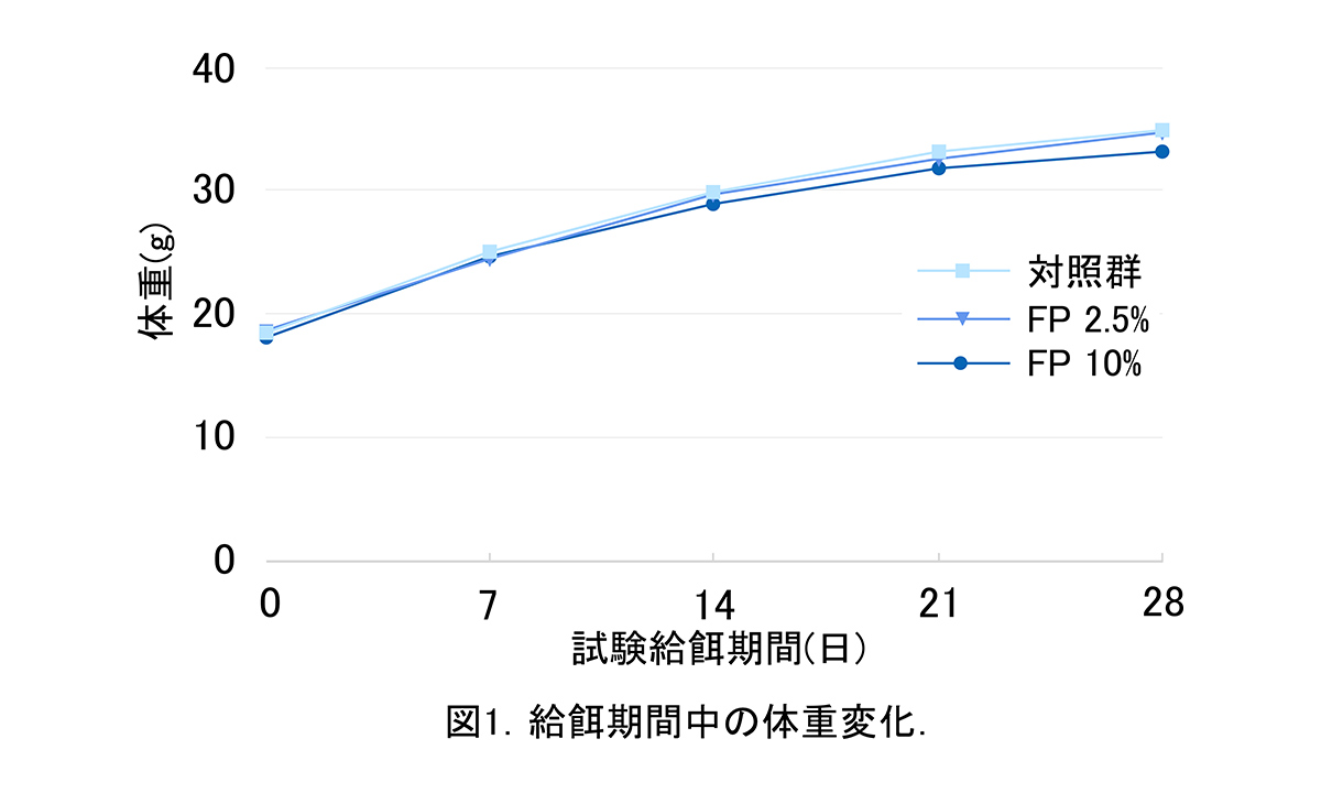給餌期間中を通して各群間で、摂餌量、摂水量に差は認められなかった。給餌期間中における体重増加は各群間で有意な差は認められなかったが、10%(w/w)のFP添加群で試験餌料給餌14日以降の体重増加量が少ない傾向にあった(図1)。
