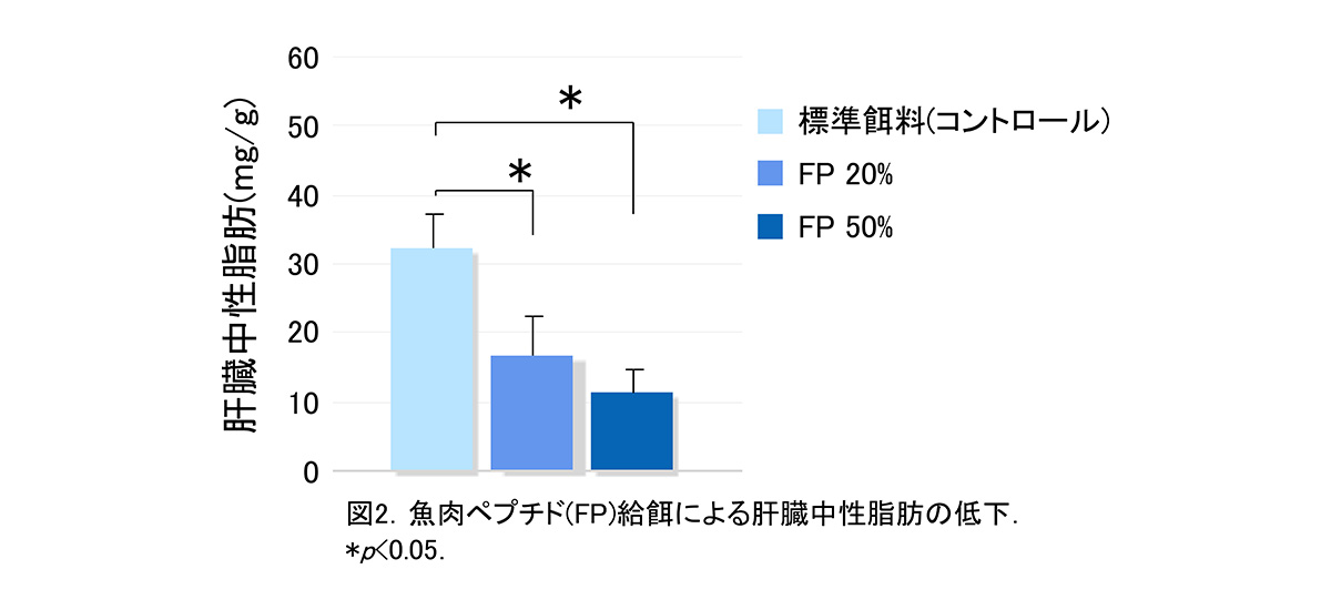 近年、食品タンパク質由来ペプチドが血圧降下作用や代謝促進、疲労回復効果など様々な生体調節機能を有することが明らかとなってきた。本研究では魚肉タンパク質を酵素分解して得られる魚肉ペプチド(FP)による中性脂肪の軽減効果について検証した。
