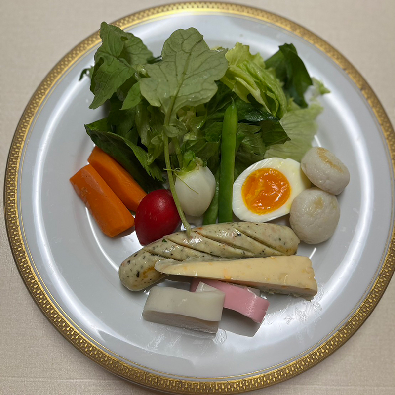 茶道の仕事は座ったり立ったりを繰り返しながら道具を運んだりと想像以上に肉体労働で、静的なイメージが強いと思うのですが結構ハードなんです。昼に食べるサラダは沢山の野菜に加えて卵やチキンのたんぱく質や、かまぼこなどの魚肉たんぱくがドーンと乗っているいわゆるパワーサラダで、1日動き回っても大丈夫です。