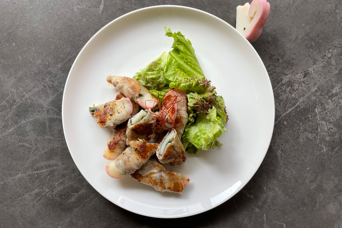 肉巻きにしました。これまでかまぼこと言うと、副菜とか、添え物、箸休めで食べるイメージでした。これをどうにかメインに使いたくて、野菜の代わりにかまぼこを使って肉巻きにしたんです。あとは親子丼の鶏肉の部分をかまぼこにしたり……。揚げてみても美味しそうですね。